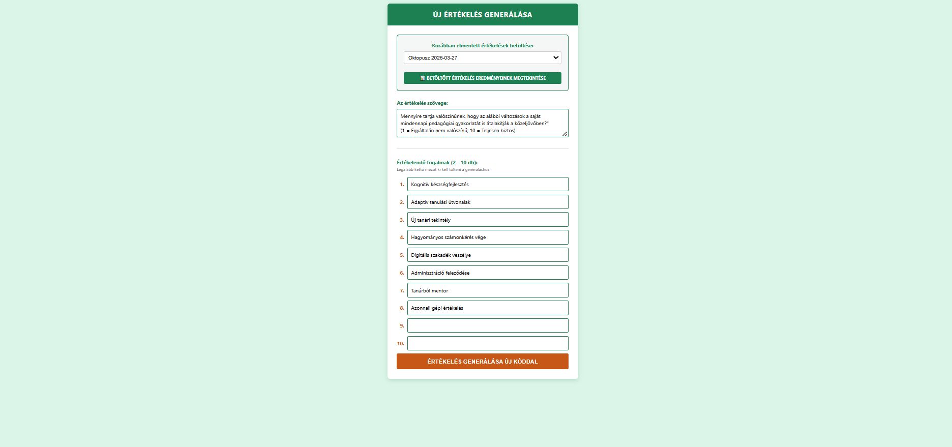 Saját értékelések létrehozása: A tanár szabadon megadhat 2 és 10 közötti témát, kérdést vagy fogalmat, amiben a diákok véleményét kéri.