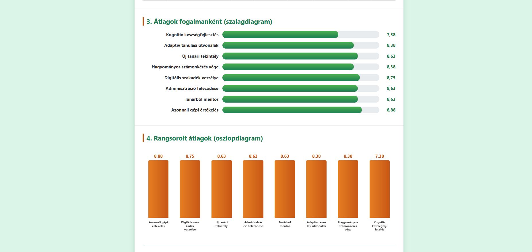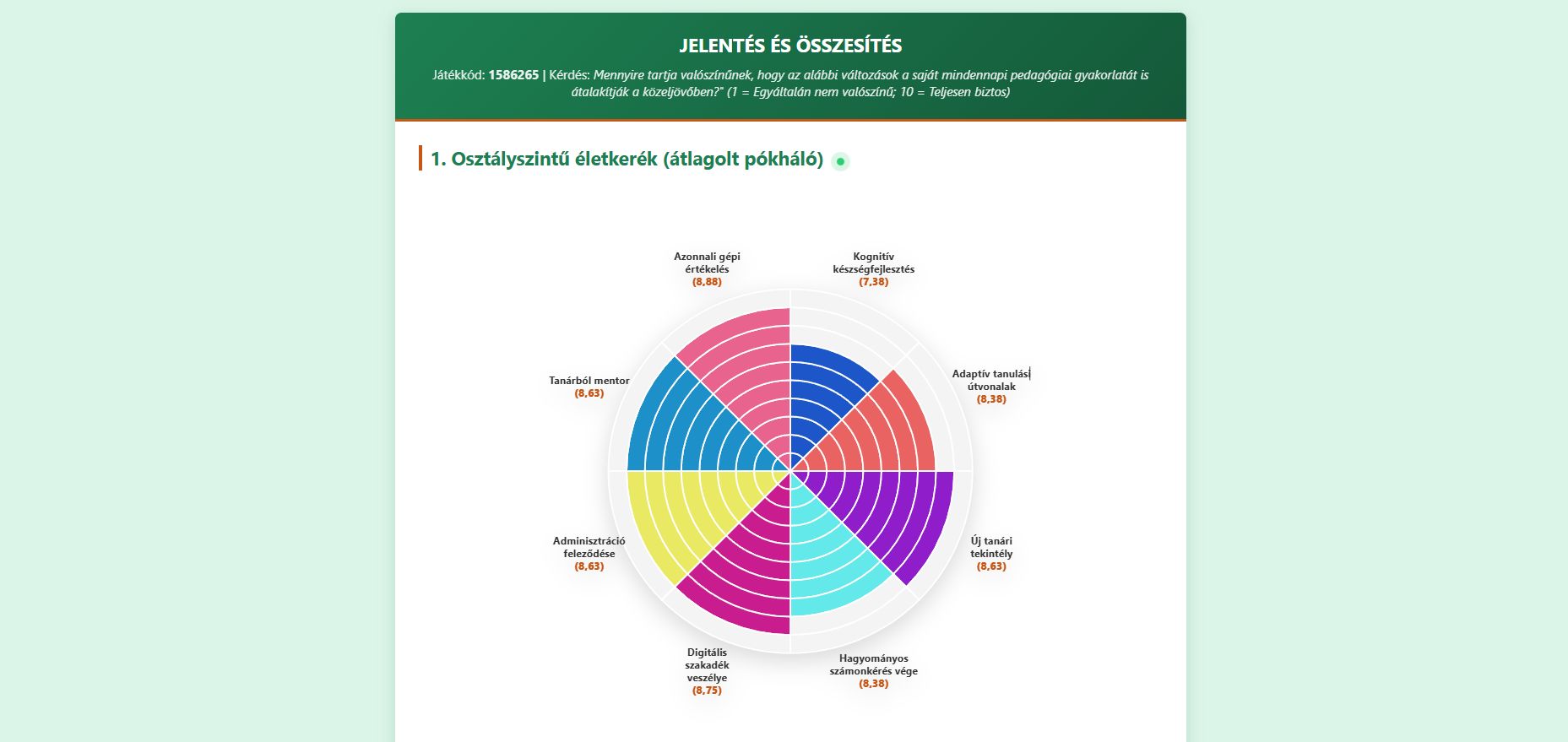 Élő, azonnali statisztika: A tanári képernyőn az eredmények folyamatosan, maguktól frissülnek, ahogy a diákok nyomkodják a gombokat. Látványos kör- és oszlopdiagramok mutatják az osztály átlagát, a rendszer pedig külön jelzi, ha valaki gyanúsan gyorsan, odafigyelés nélkül kattintgatta végig a feladatot.