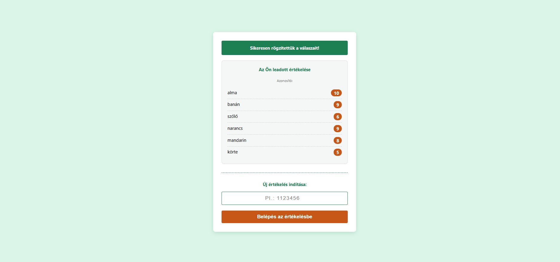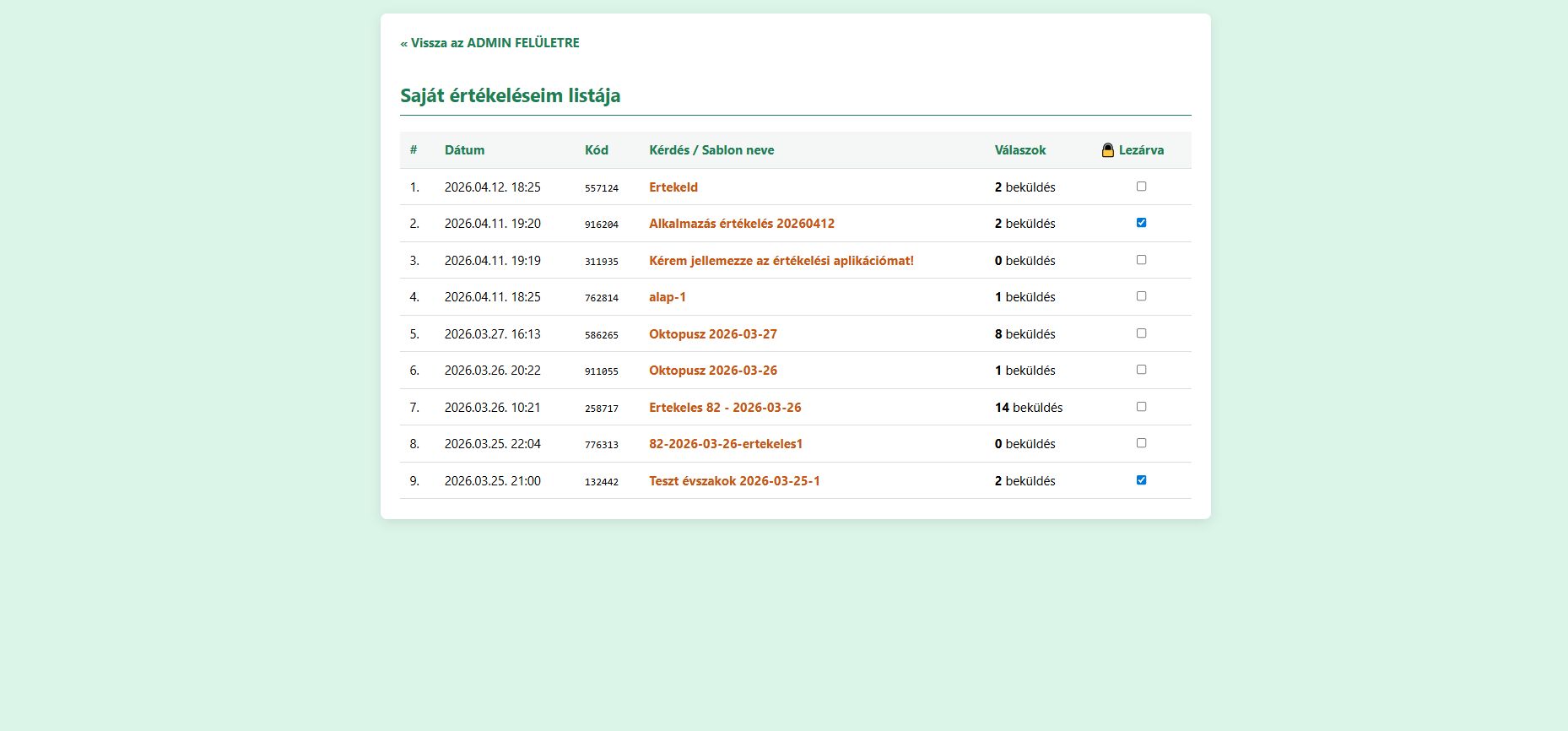 Pontos tájékoztatás: Ha egy diák olyan kódot ír be, amit a tanár már lezárt (a lakat funkcióval), a rendszer udvariasan kiírja neki, hogy ez az értékelés már befejeződött, és nem engedi a kitöltést.