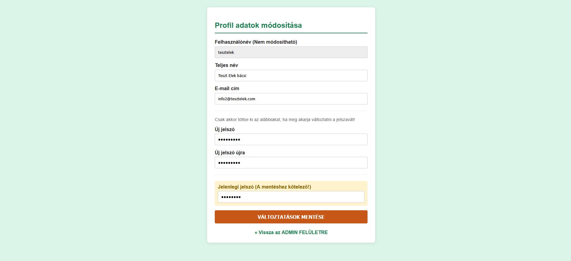 Biztonságos adatmódosítás: A név és az e-mail cím bármikor megváltoztatható, de a rendszer ehhez mindig elkéri a jelenlegi jelszót – így védve a fiókot, ha a tanár esetleg bejelentkezve felejtené magát egy iskolai gépen.