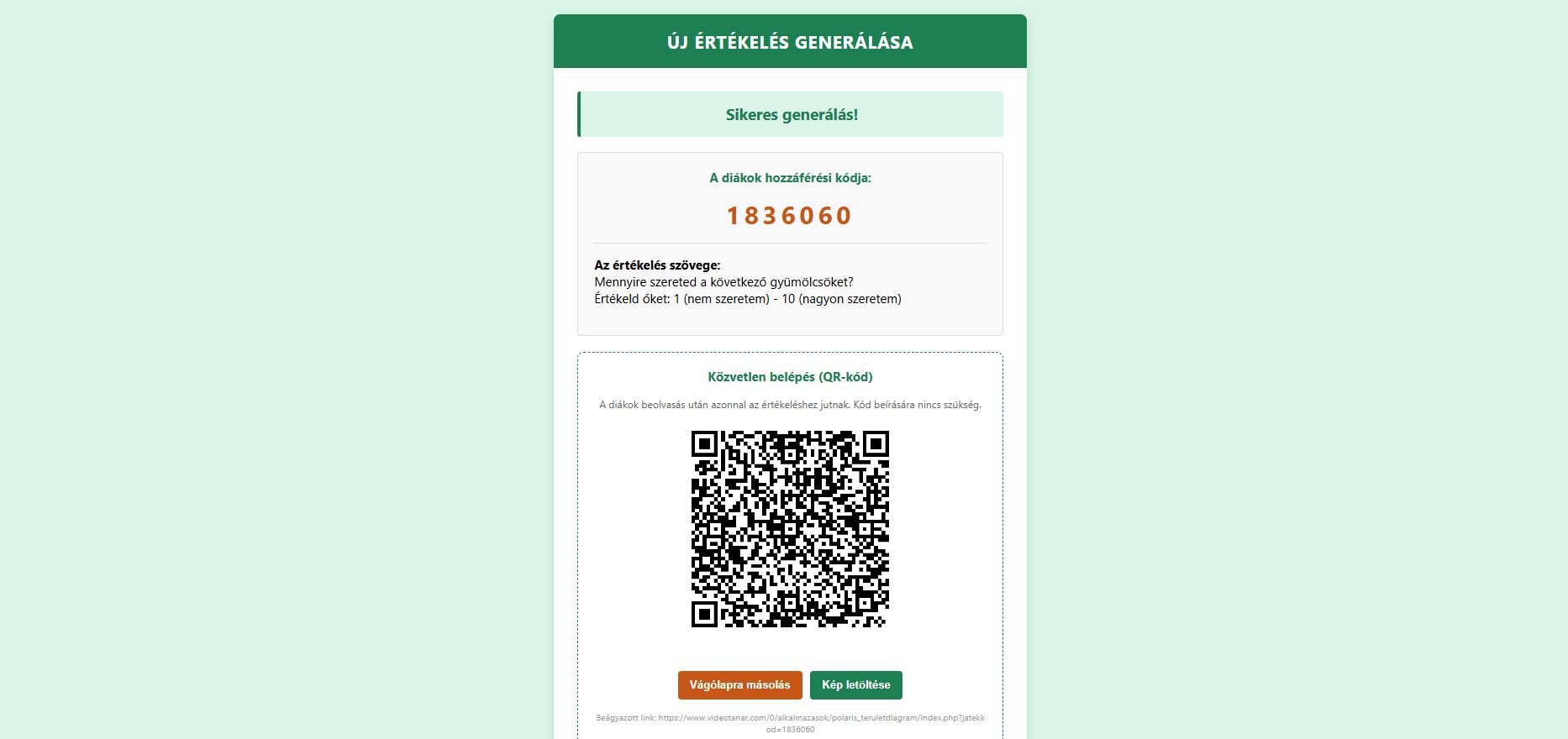 Gyors megosztás az osztállyal: A rendszer minden értékeléshez automatikusan készít egy 6 jegyű kódot és egy kivetíthető QR-kódot. A diákok ezt használják a belépéshez.