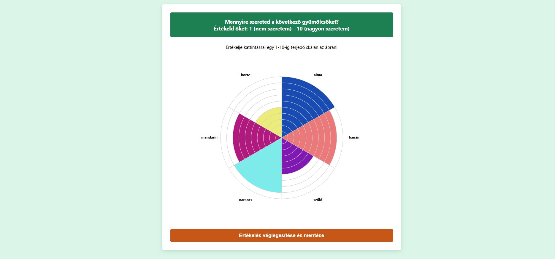 Játékos, színezhető értékelő kerék: Unalmas kérdőívek helyett egy 10 szintes, tortaszeletekre osztott kört látnak. Ahogy kattintanak a szintekre, a diagram színesen feltöltődik. Ez a vizuális élmény sokkal élvezetesebbé teszi a visszajelzést.