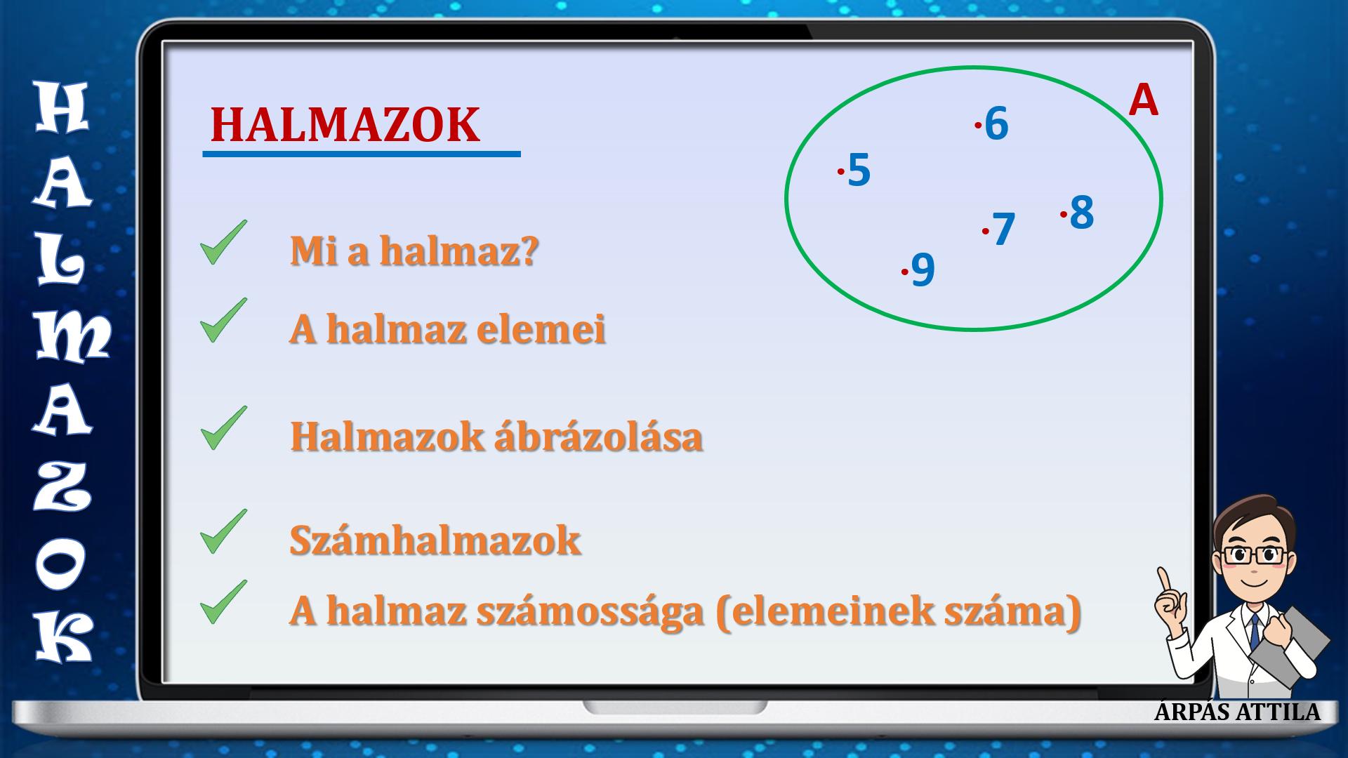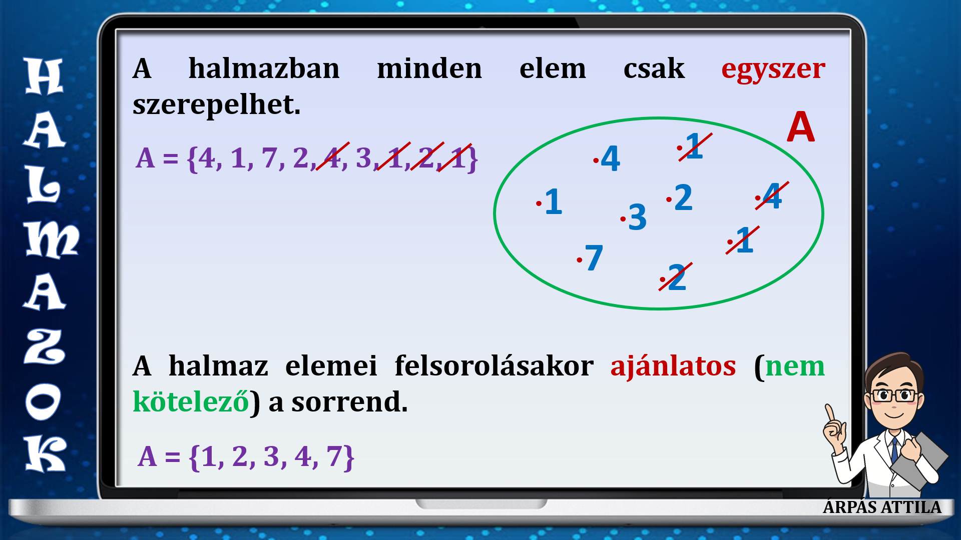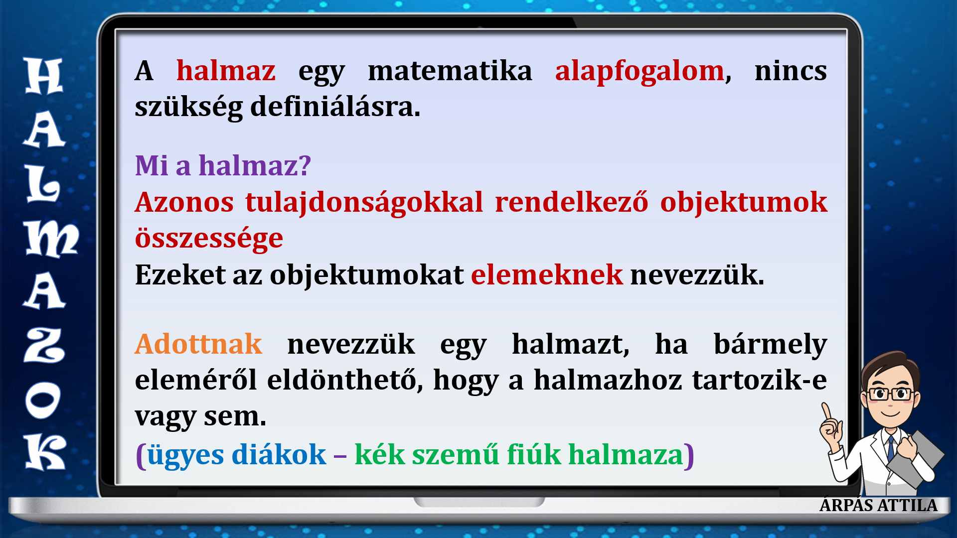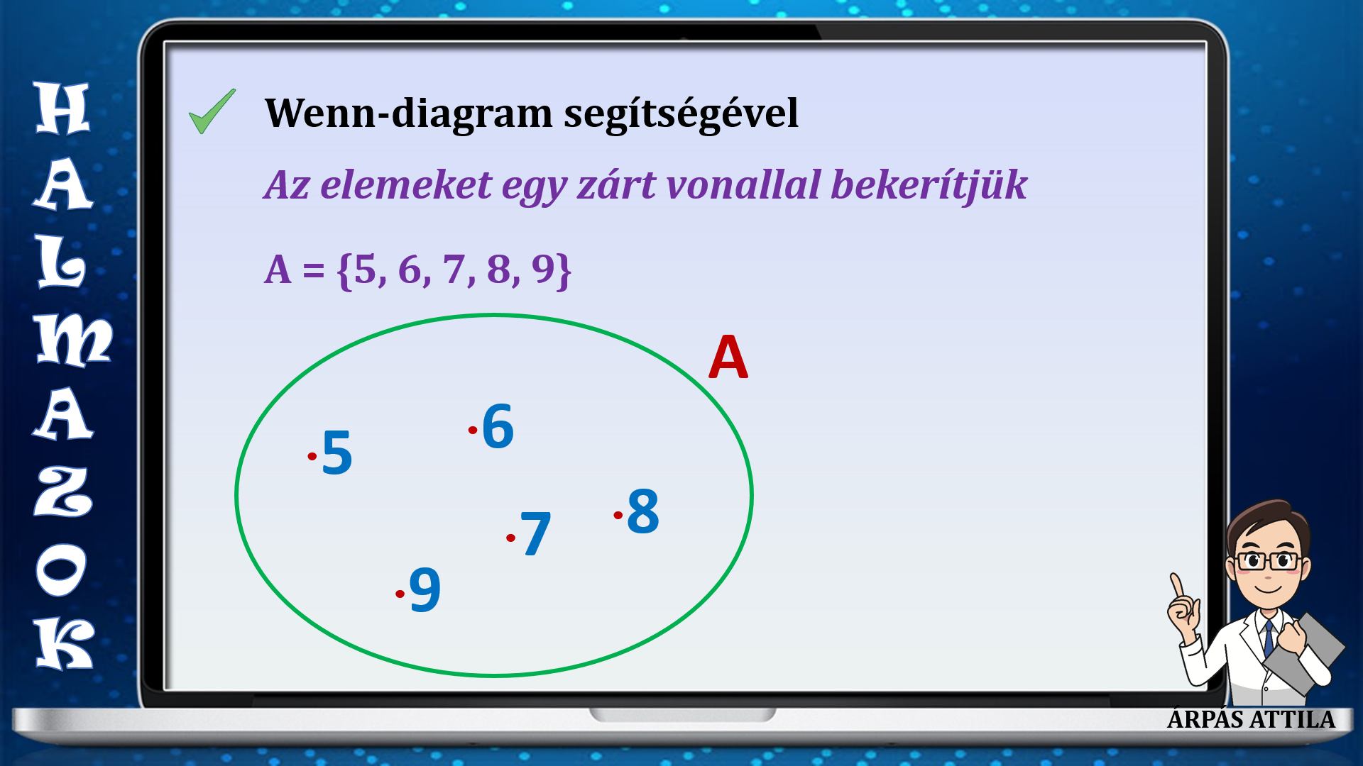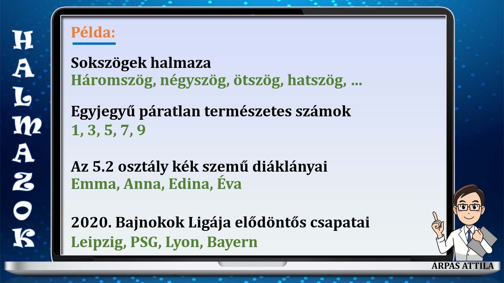Ebben a sorozatban a halmazokról tanulunk. Mi a halmaz, mi a halmaz eleme? Láthatunk példákat különböző halmazokra.