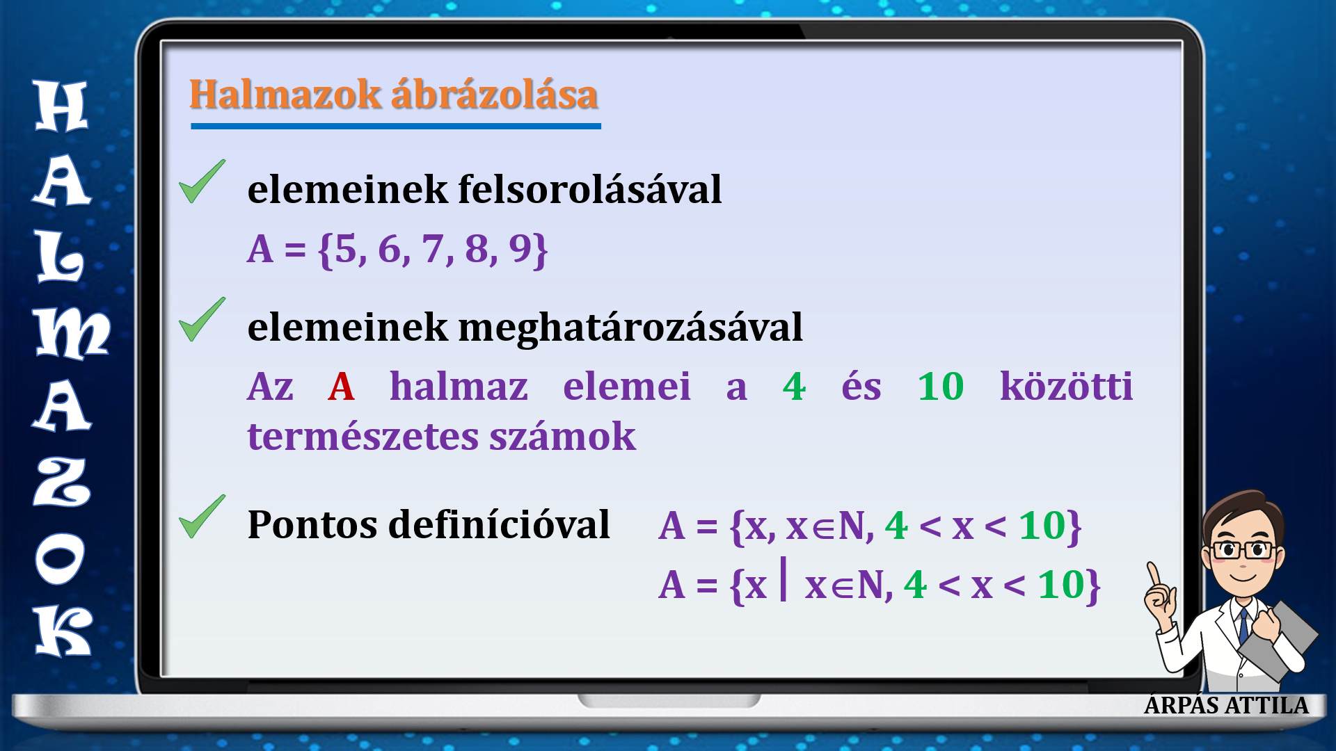 Megismerkedünk a halmazok ábrázolási lehetőségeivel (elemei felsorolásával, elemeinek meghatározásával, pontos definícióval, Wenn-diagrammal).