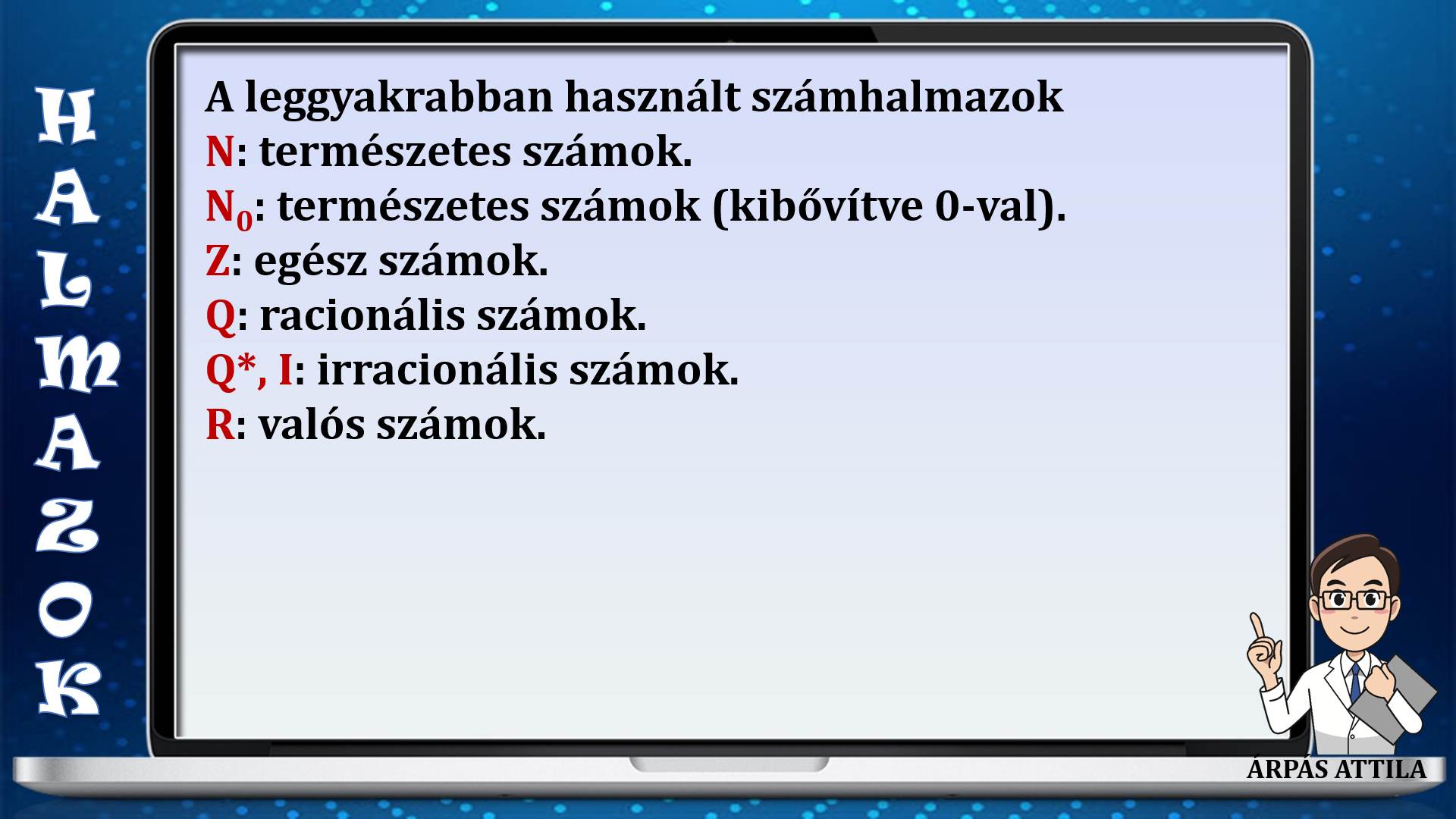 A lecke utolsó részében összegezzük a különböző számhalmazokat (természetes számok, egész számok, racionális számok, irracionális számok, valós számok). A halmaz elemeinek száma adja a halmaz számosságát.