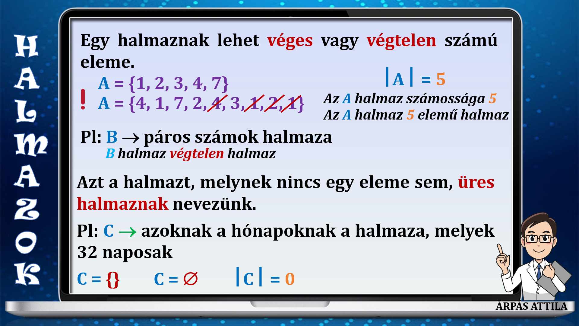 Meghatározzuk a halmaz elemeit, megismerkedünk a véges, végtelen és üres halmaz fogalmával.