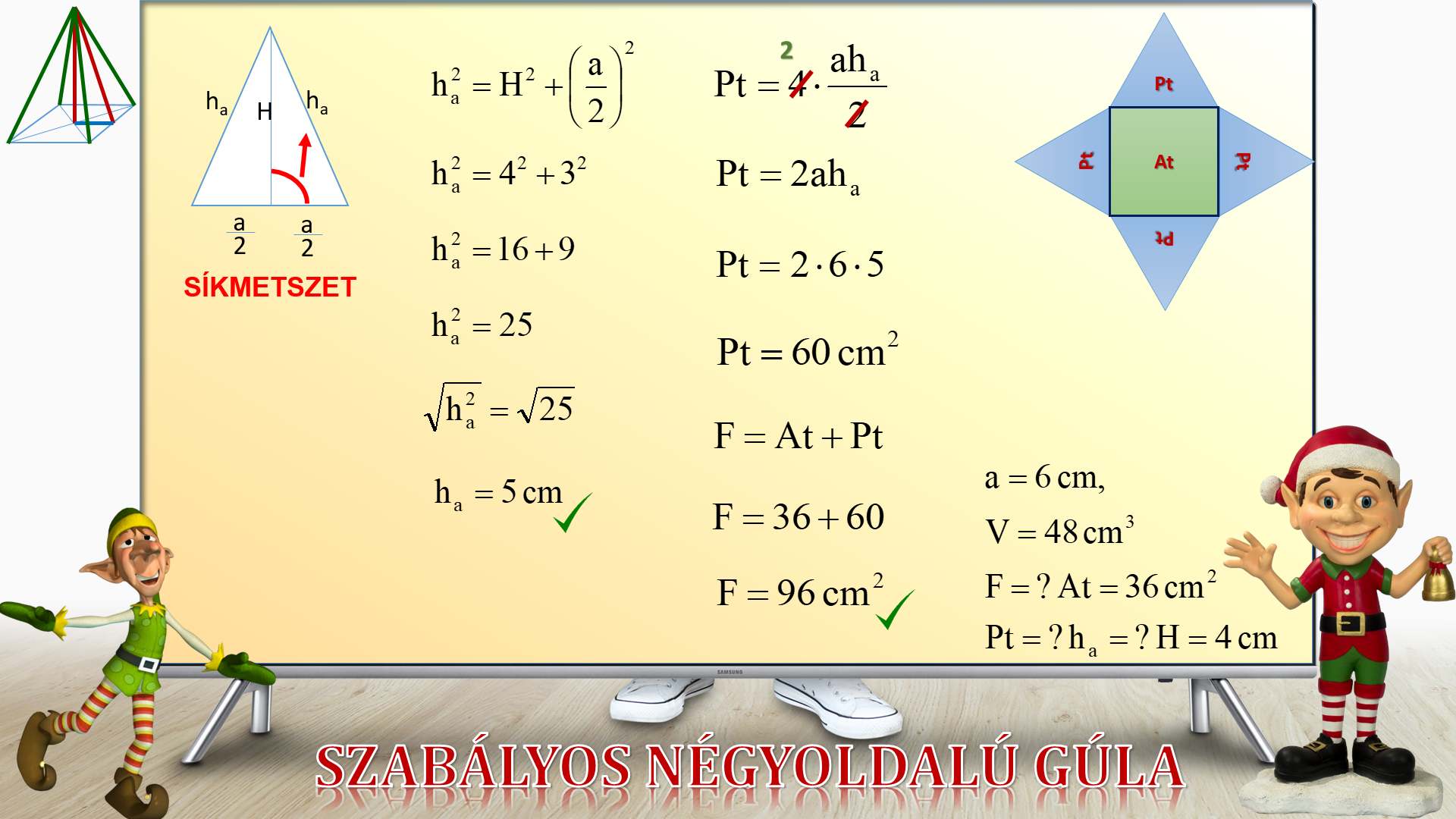 GÚLA FELSZÍNE ÉS TÉRFOGATA (KIDOLGOZOTT ALAPSZINTŰ FELADATOK – SZABÁLYOS HÁROM, NÉGY ÉS HATOLDALÚ GÚLA)