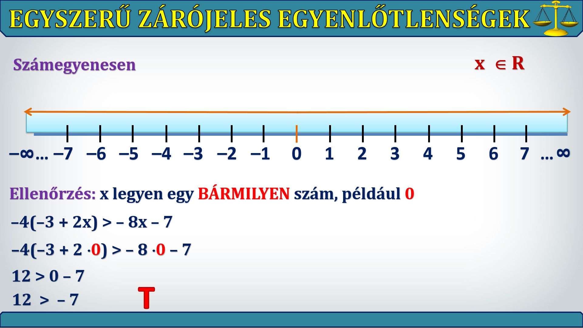 Ebben a leckében 5 egyszerű, zárójeleket is tartalmazó egyenlőtlenség megoldásának lépéseit tanuljuk meg.