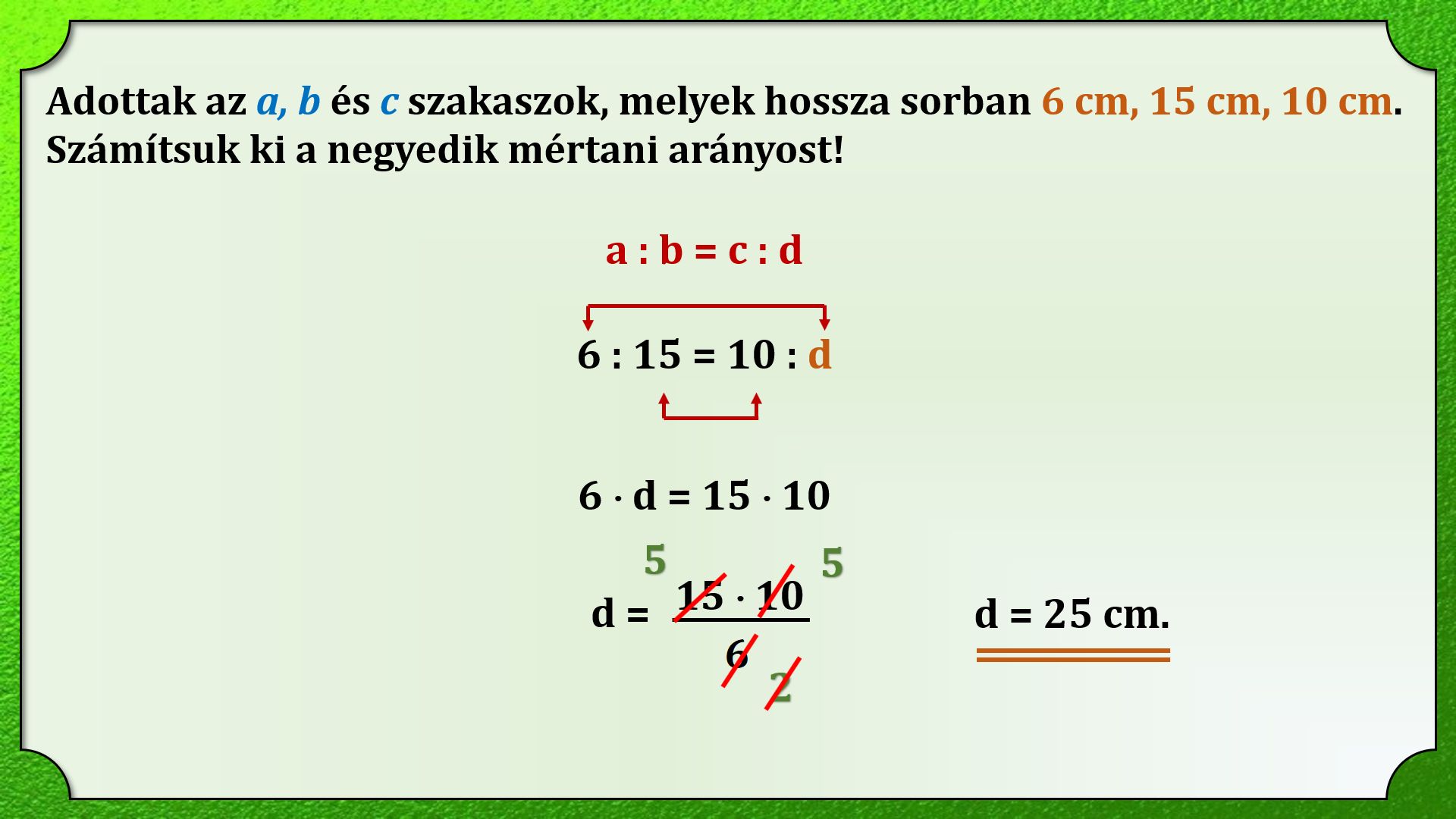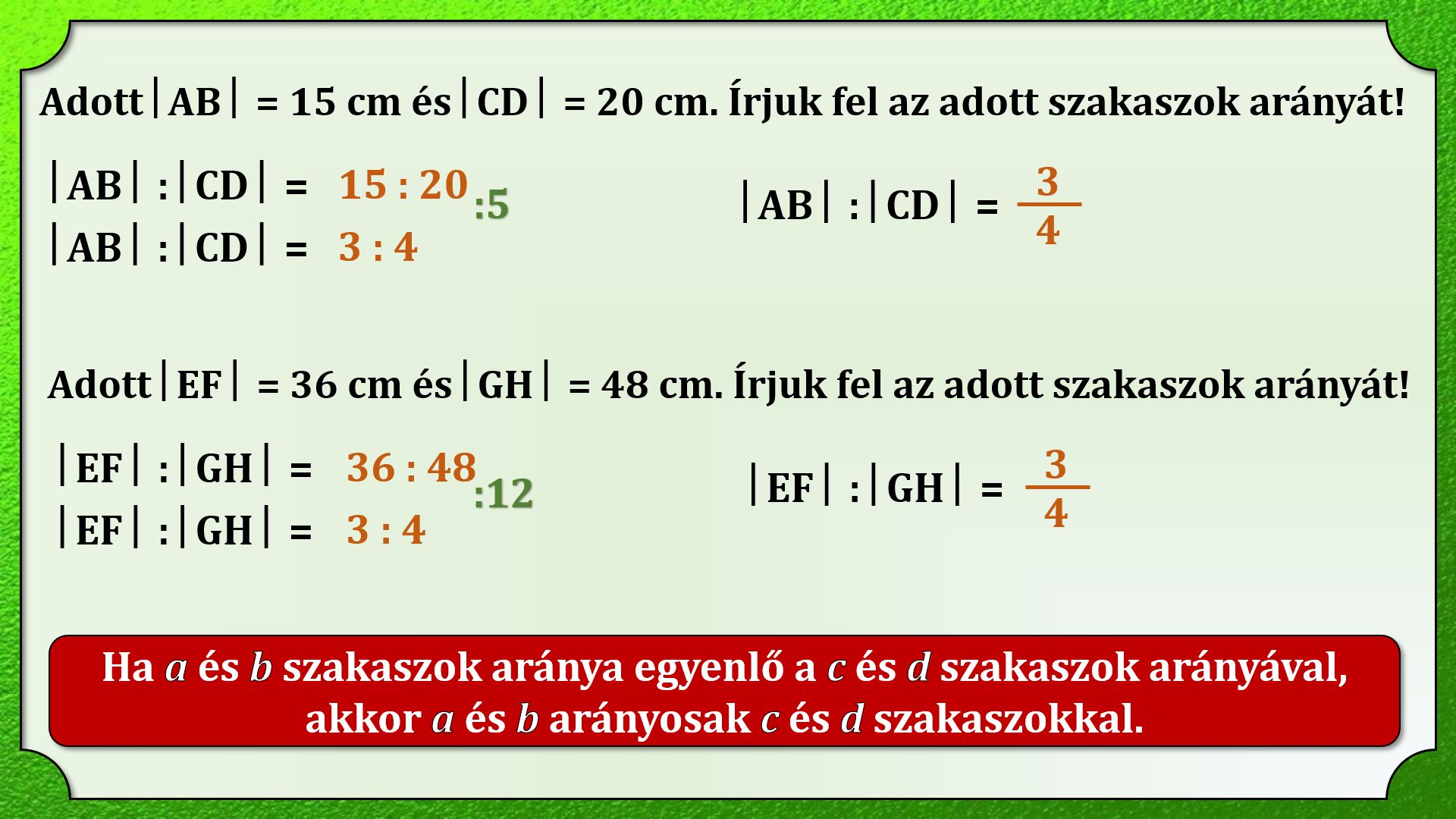 Ebben a leckében az arányos szakaszokról tanulunk. Három ismert szakasznak meghatározhatjuk a negyedik arányos szakaszt (a szakaszok negyedik mértani arányosát). A lecke végén röviden említést teszünk az aranymetsztről.