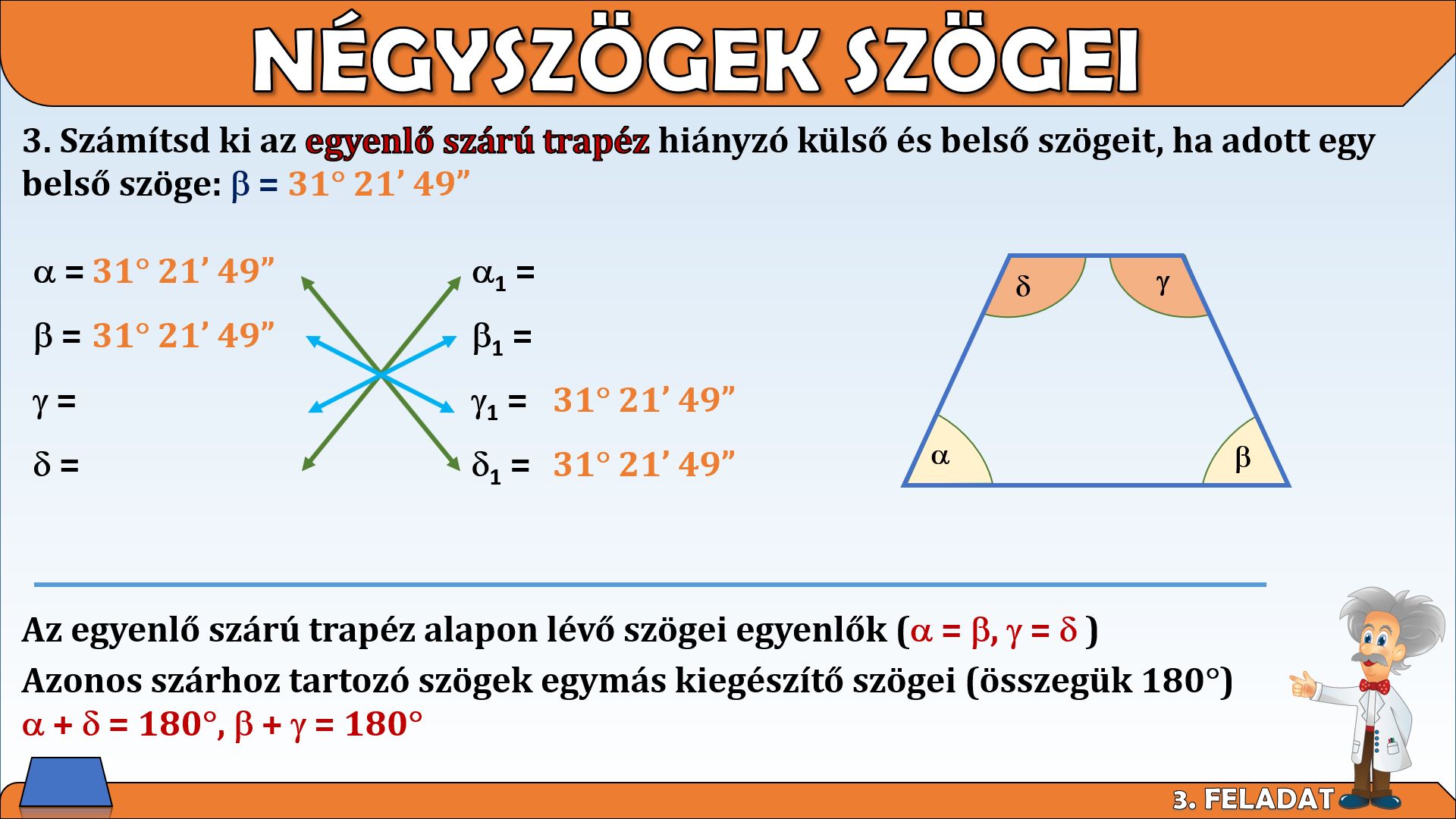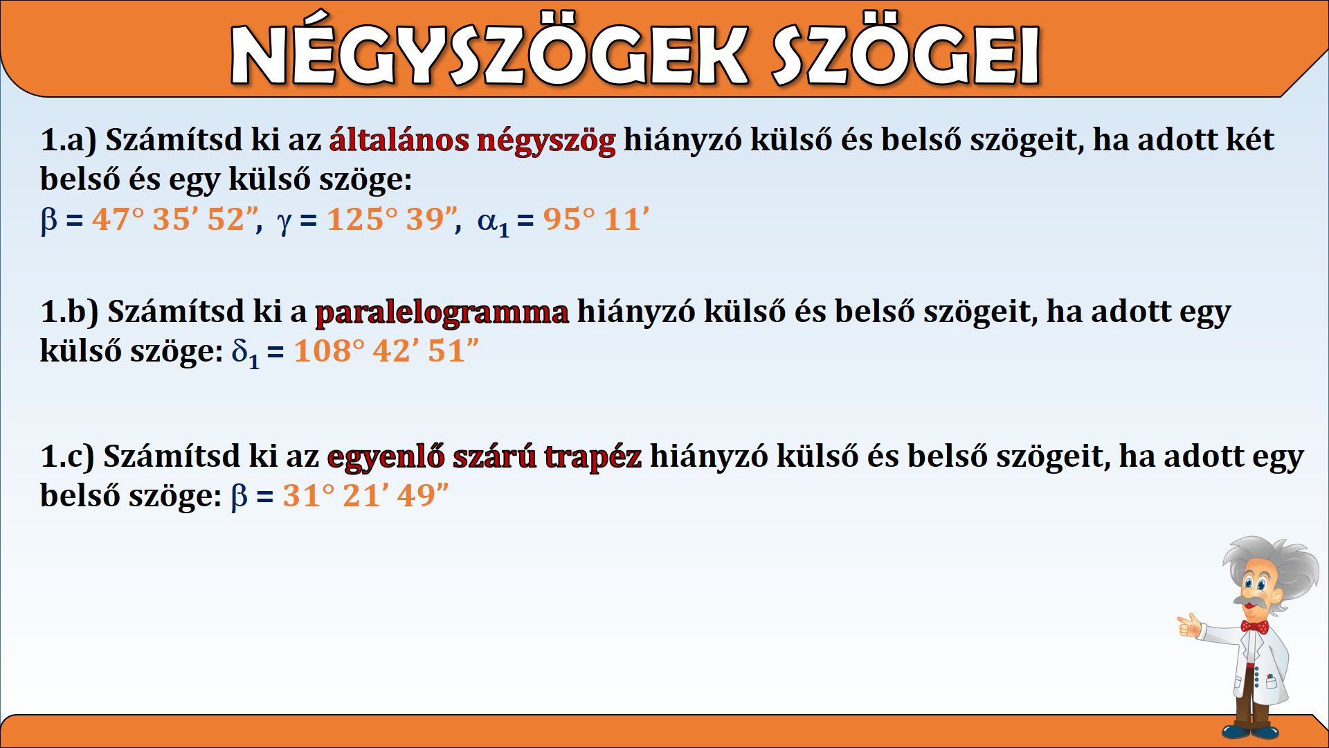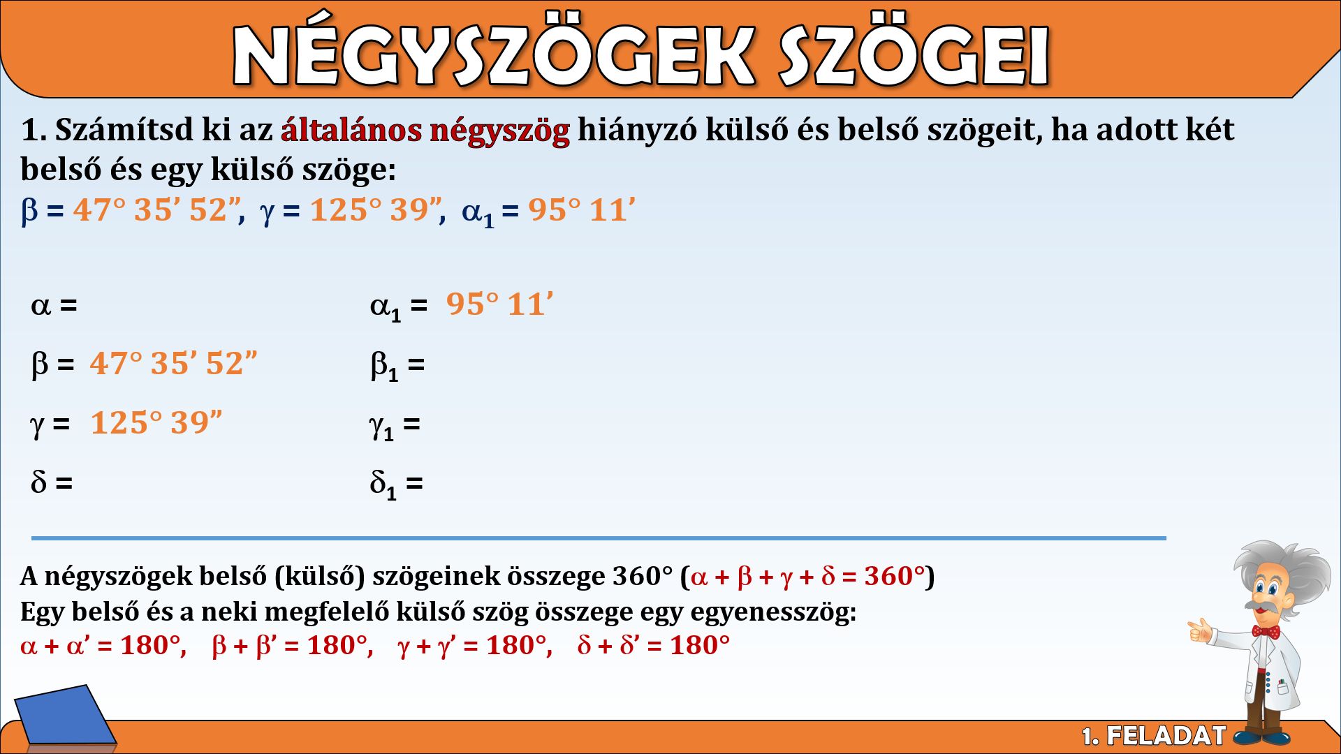 1) NÉGYSZÖGEK HIÁNYZÓ SZÖGEINEK KISZÁMÍTÁSA (ÁLTALÁNOS NÉGYSZÖG, PARALELOGRAMMA, EGYENLŐ SZÁRÚ TRAPÉZ)