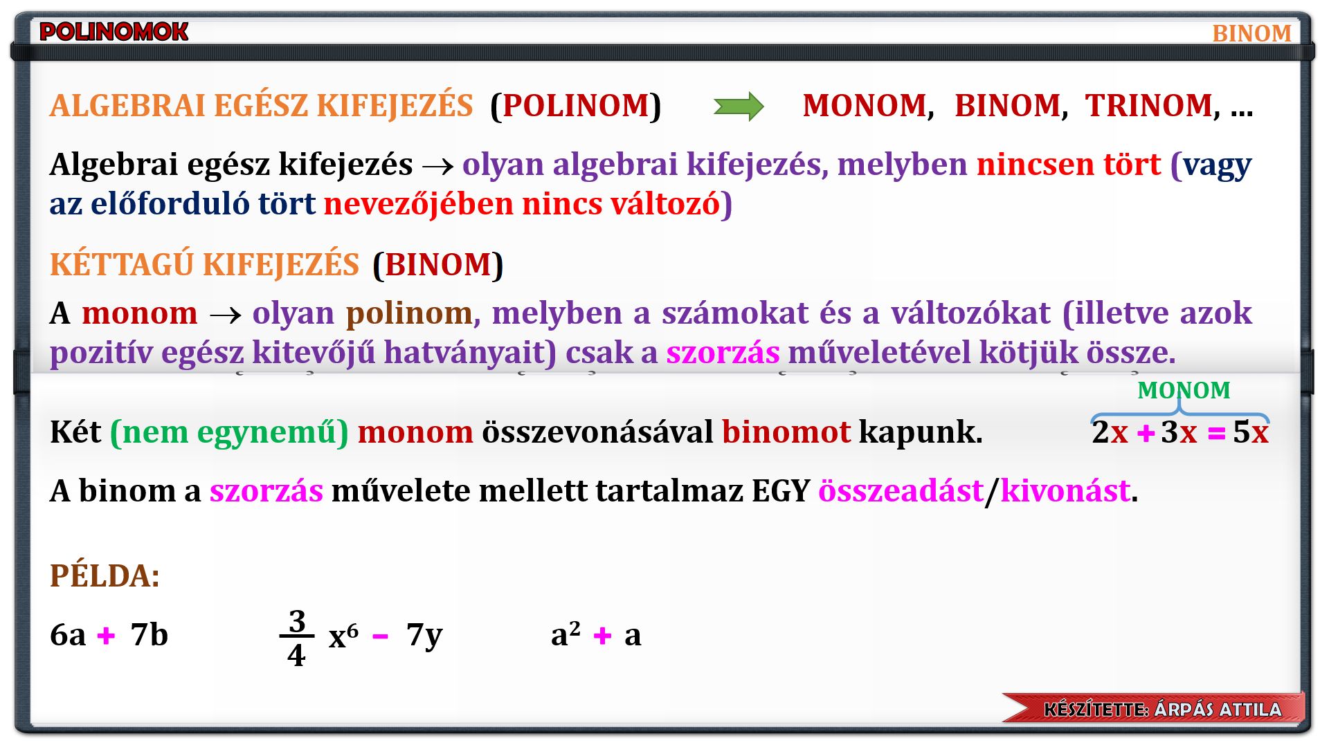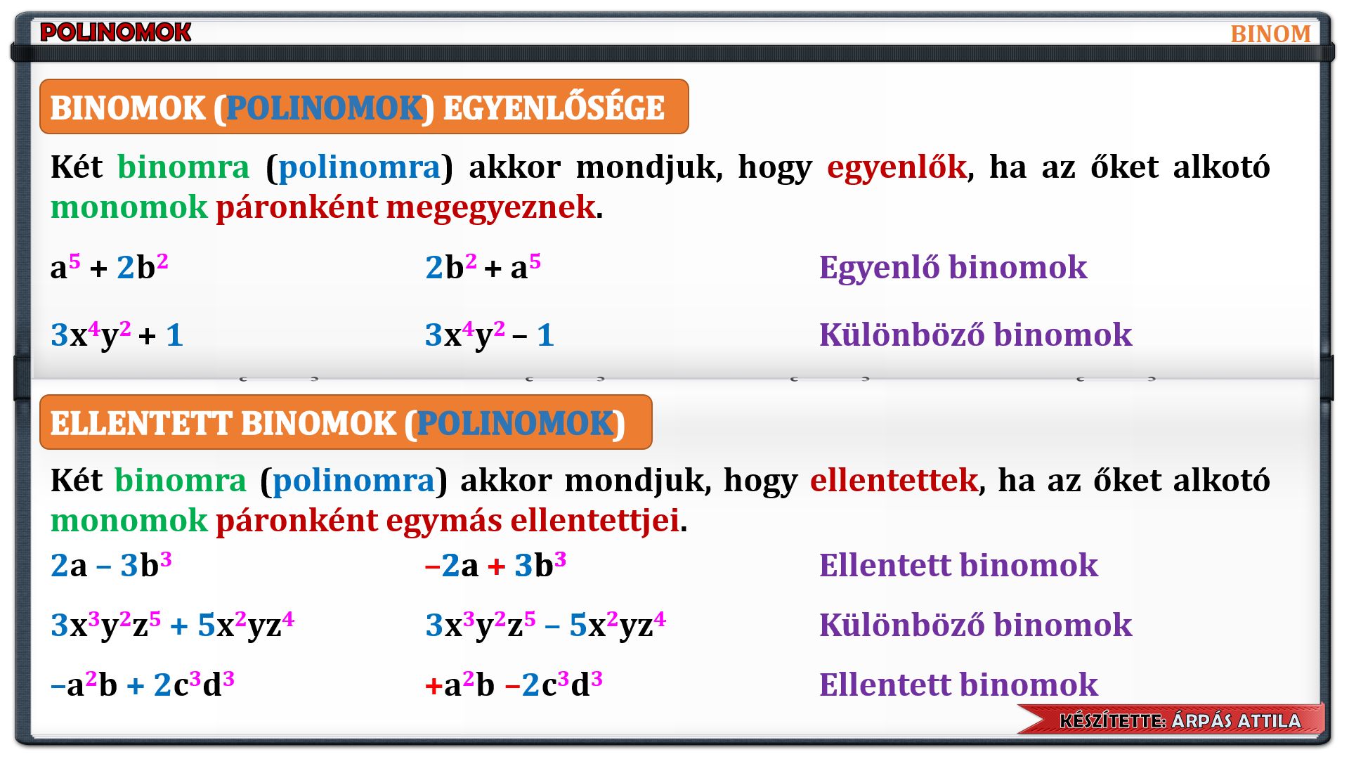 KÉTTAGÚ POLINOM - BINOM (FOGALMA, FOKSZÁMA, EGYENLŐ ÉS ELLENTETT BINOMOK, RENDEZÉSE)