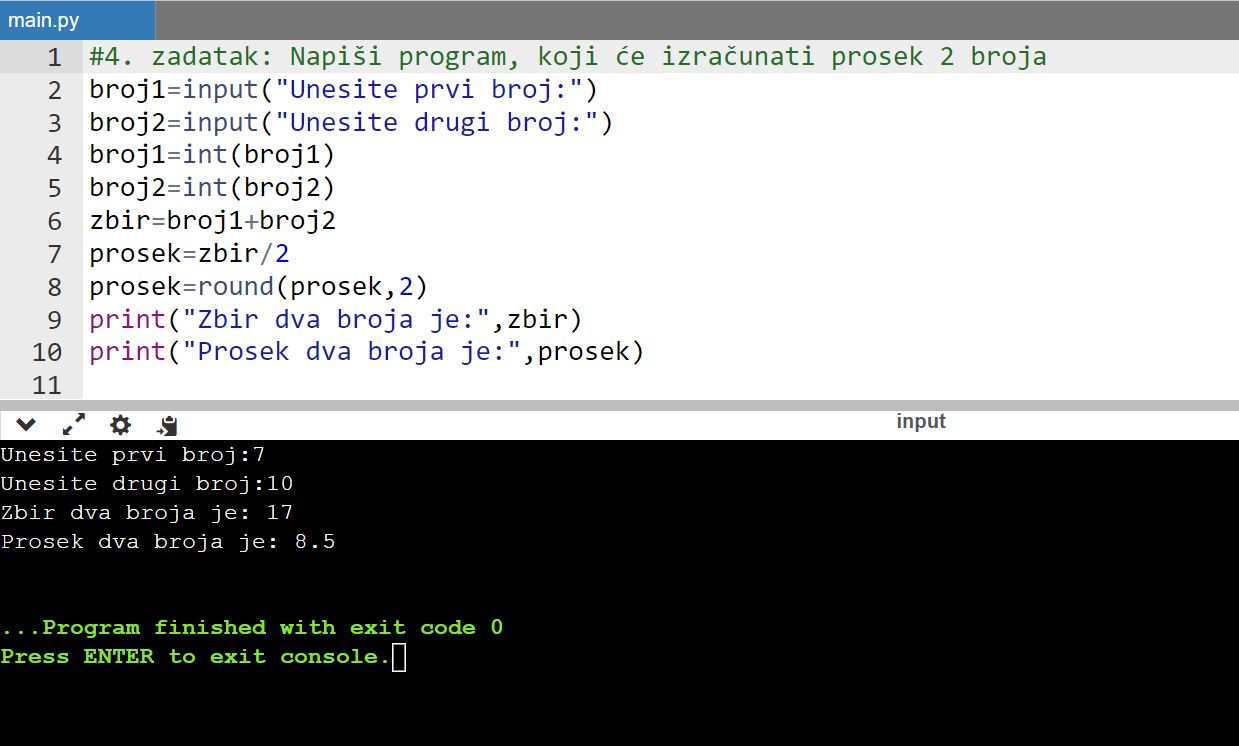4. zadatak: Napiši program, koji će izračunati prosek 2 broja