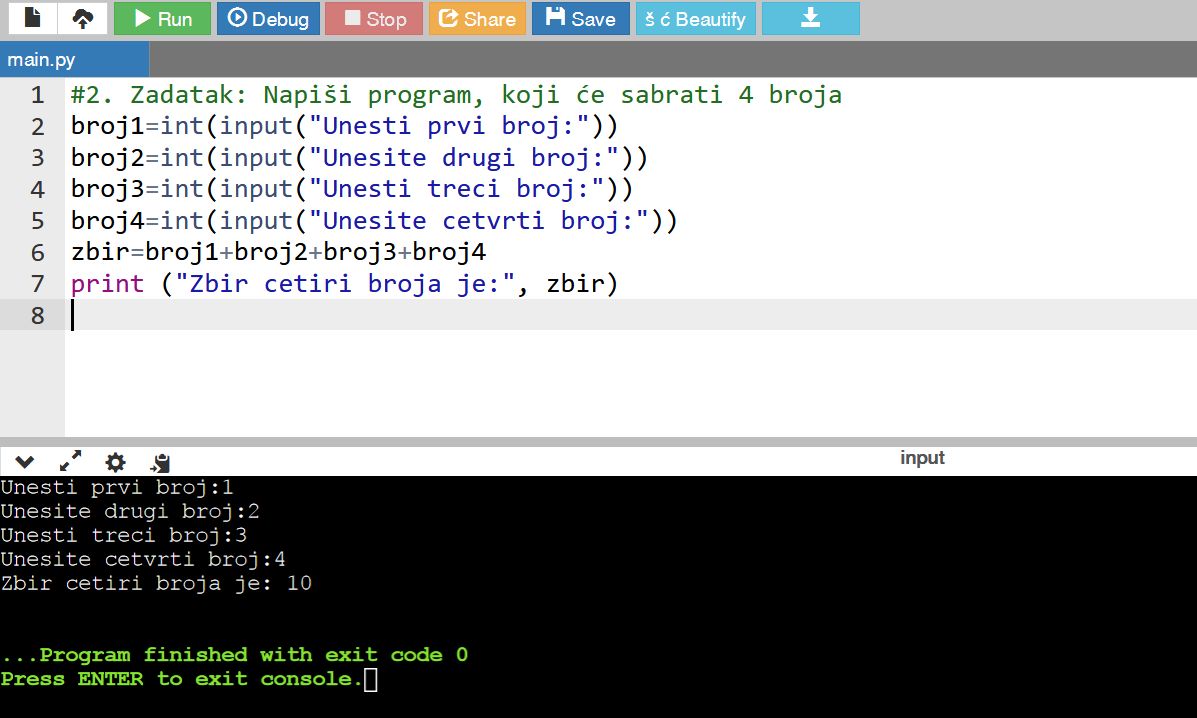 5. zadatak: Napiši program, koji će sabrati 4 broja
