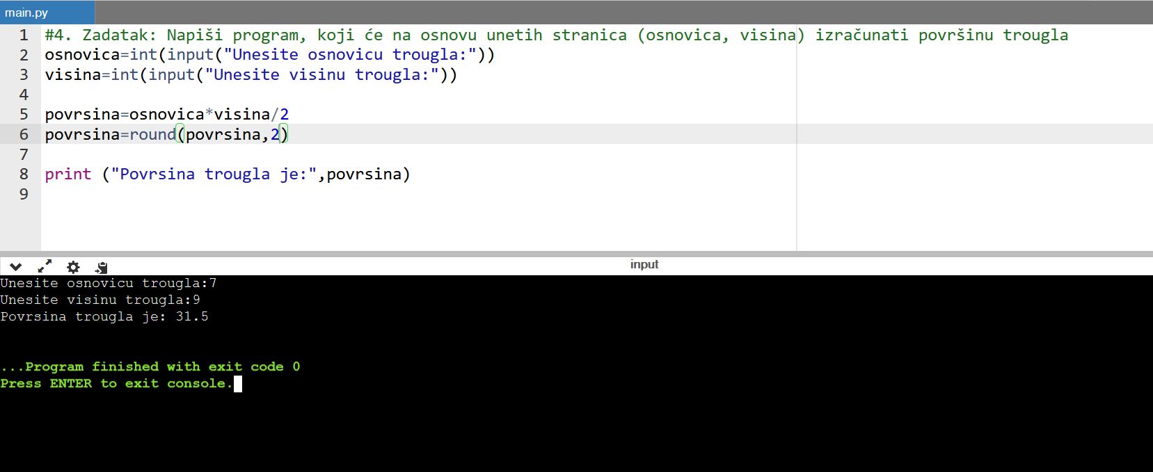 7. zadatak: Napiši program, koji će na osnovu unetih stranica (osnovica, visina) izračunati površinu trougla