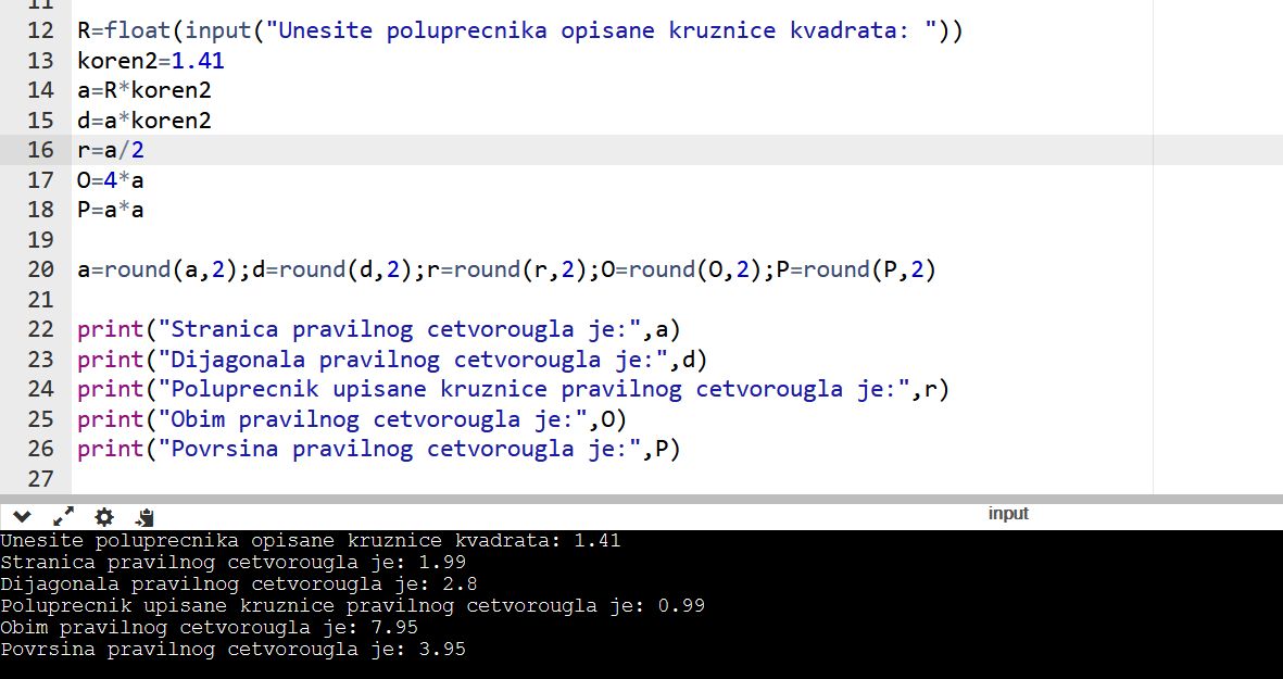 U ovoj lekciji računamo elemente pravilnog četvorougla (dijagonalu, obim, površinu, poluprečnik upisanog i opisanog kruga)