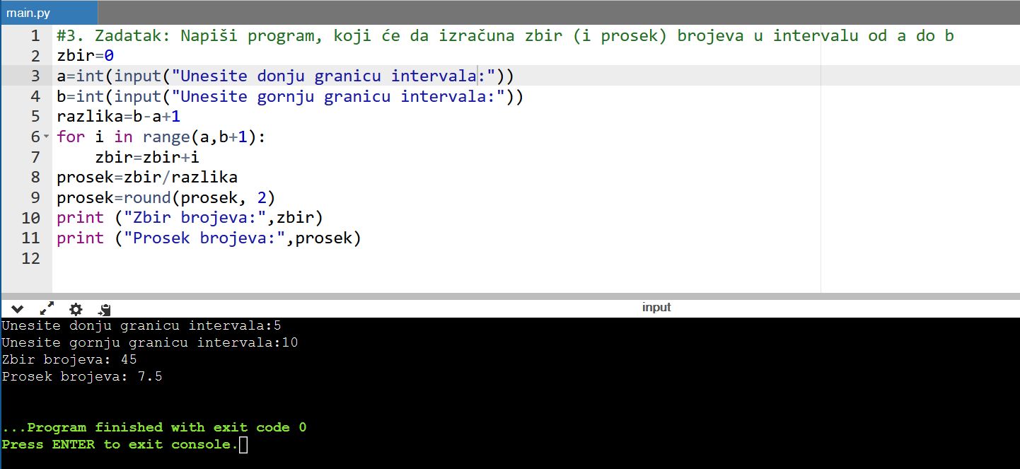 10. zadatak: Napiši program, koji će da izračuna zbir (i prosek) brojeva u intervalu od a do b