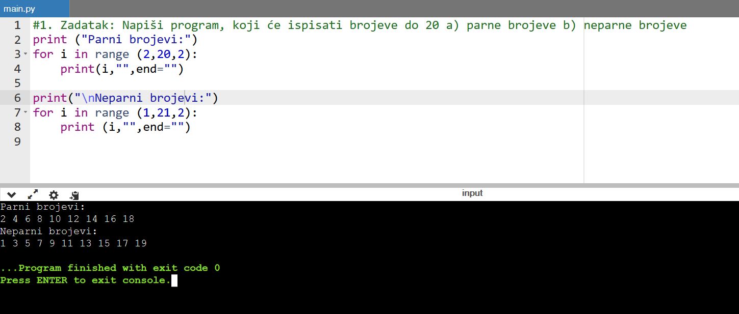 8. zadatak: Napiši program, koji će ispisati brojeve do 20 a) parne brojeve b) neparne brojeve