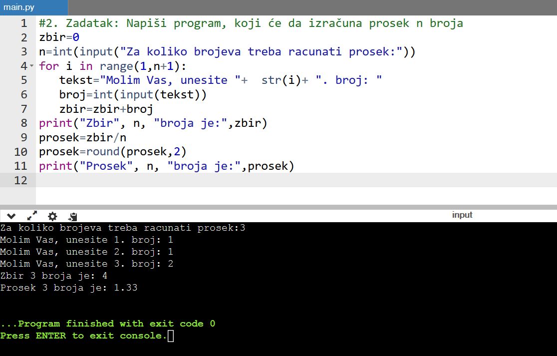 9. zadatak: Napiši program, koji će da izračuna prosek n broja